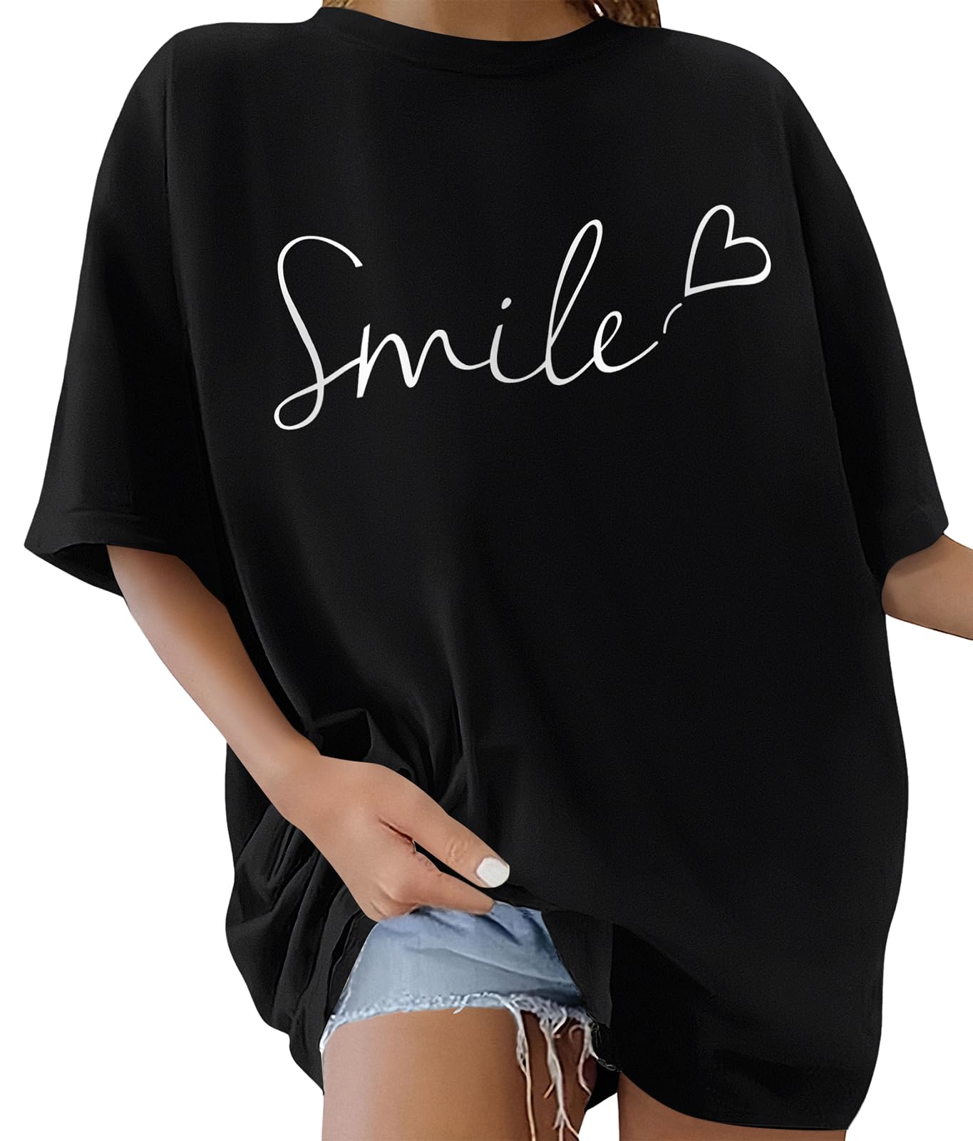 Oversize Shirt Damen T-Shirts Kurzarm Sommer Tee Tops Breite Schulter Brief Drucken Tunika Oberteile